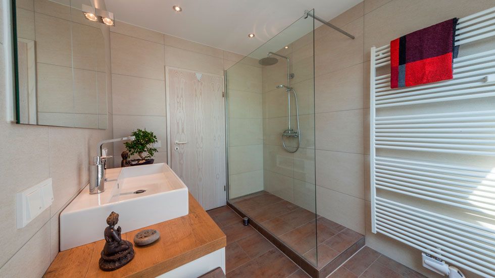 - moderne Walk-in-Dusche mit Tellerkopfbrause