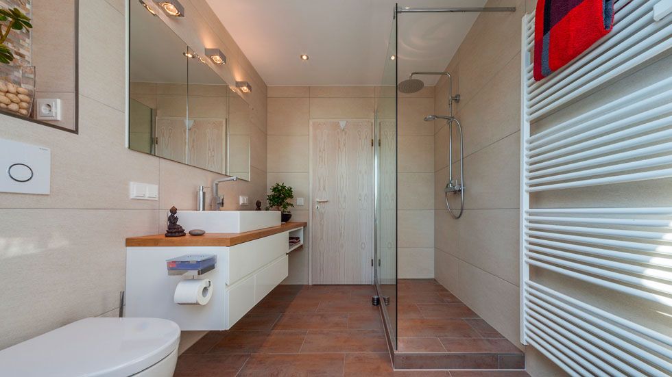 - Badheizkörper geschickt zwischen Dusche und Wirlpool paltziert