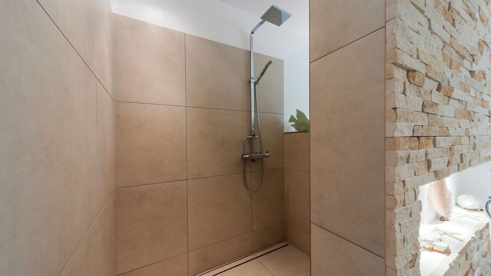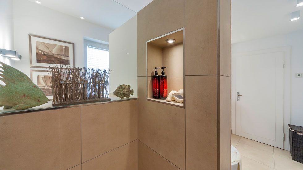 - bodengleicher abgetrennter heller Duschbereich mit funktioneller Nische